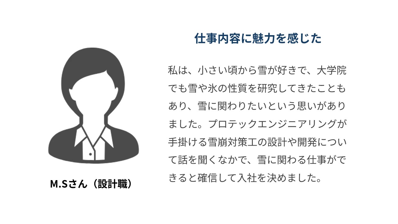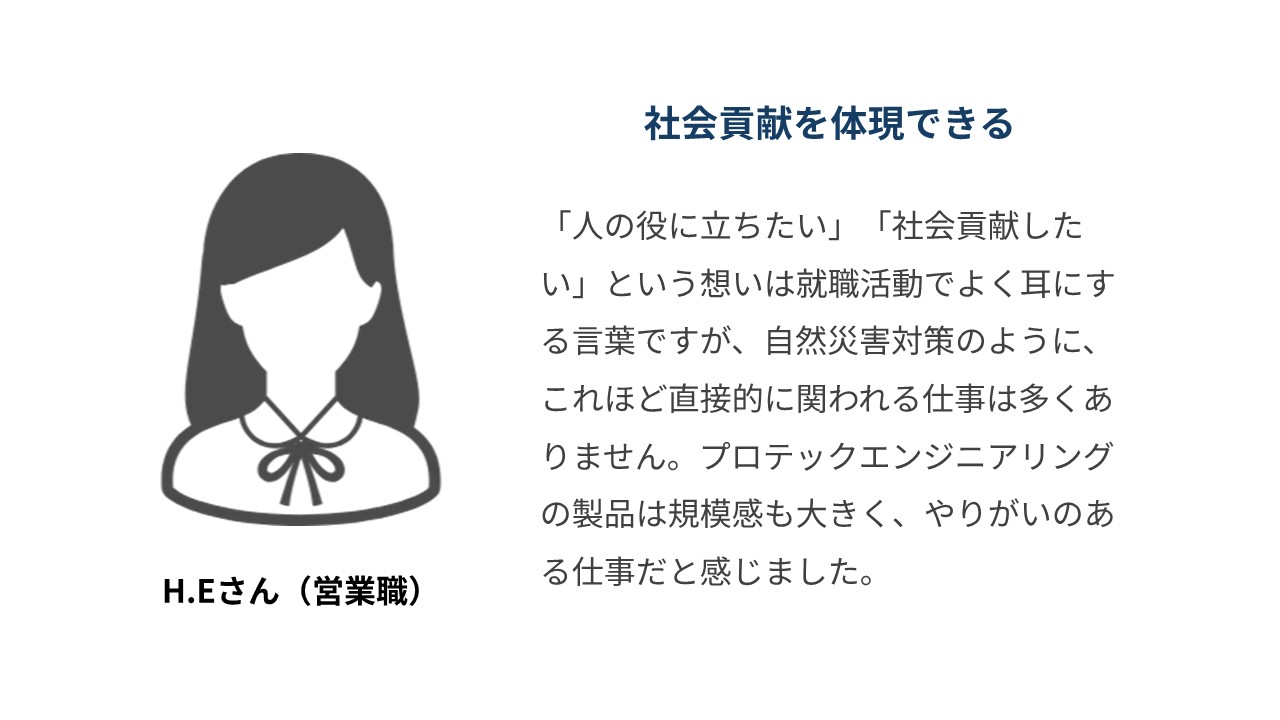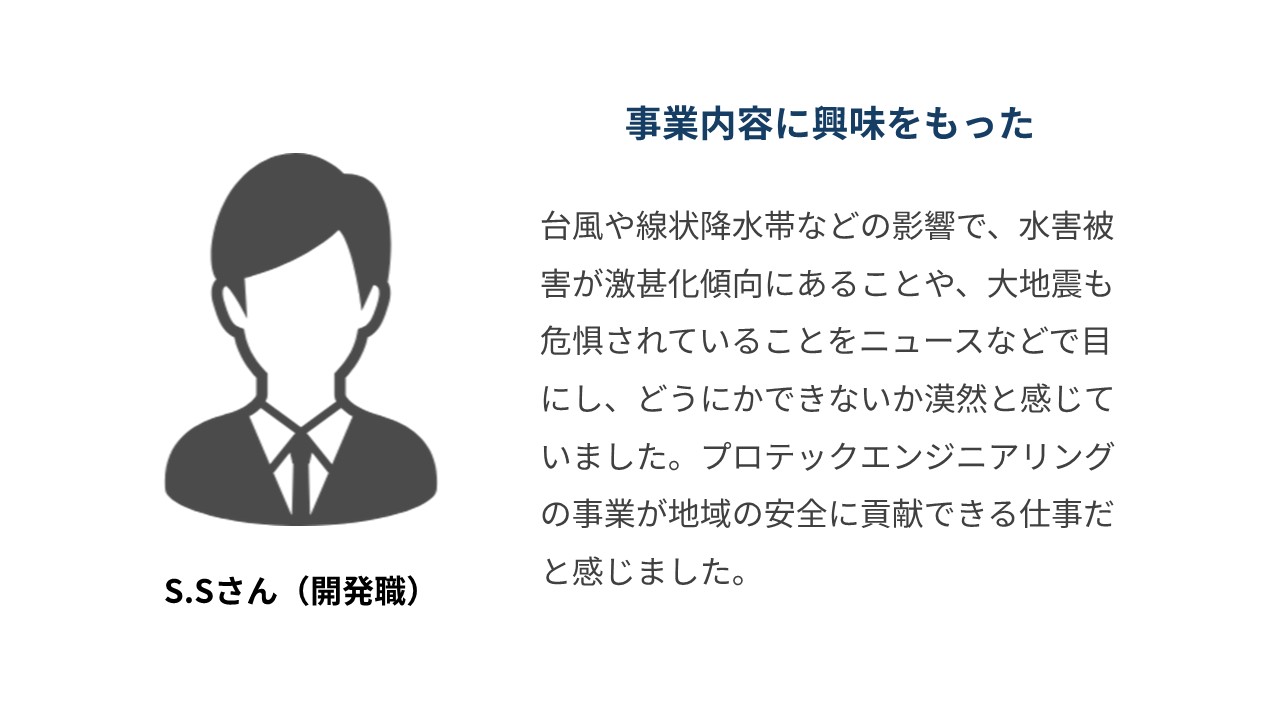 • 就職活動で採用人数の多い大手企業を見ていたときは、学生に多くの時間を費やしたり中身まで見てくれない印象を受けたこともありました。プロテックエンジニアリングは、採用担当の方をはじめ、一人ひとりに寄り添って個人をよく見てくれる会社だと思います。日本から自然災害がなくなることは無いことから、防災という分野で会社と共に成長することができると思います。会社それぞれに魅力はたくさんあると思いますが、悔いのないように企業選びを行い、内定がもらえるよう頑張ってください。